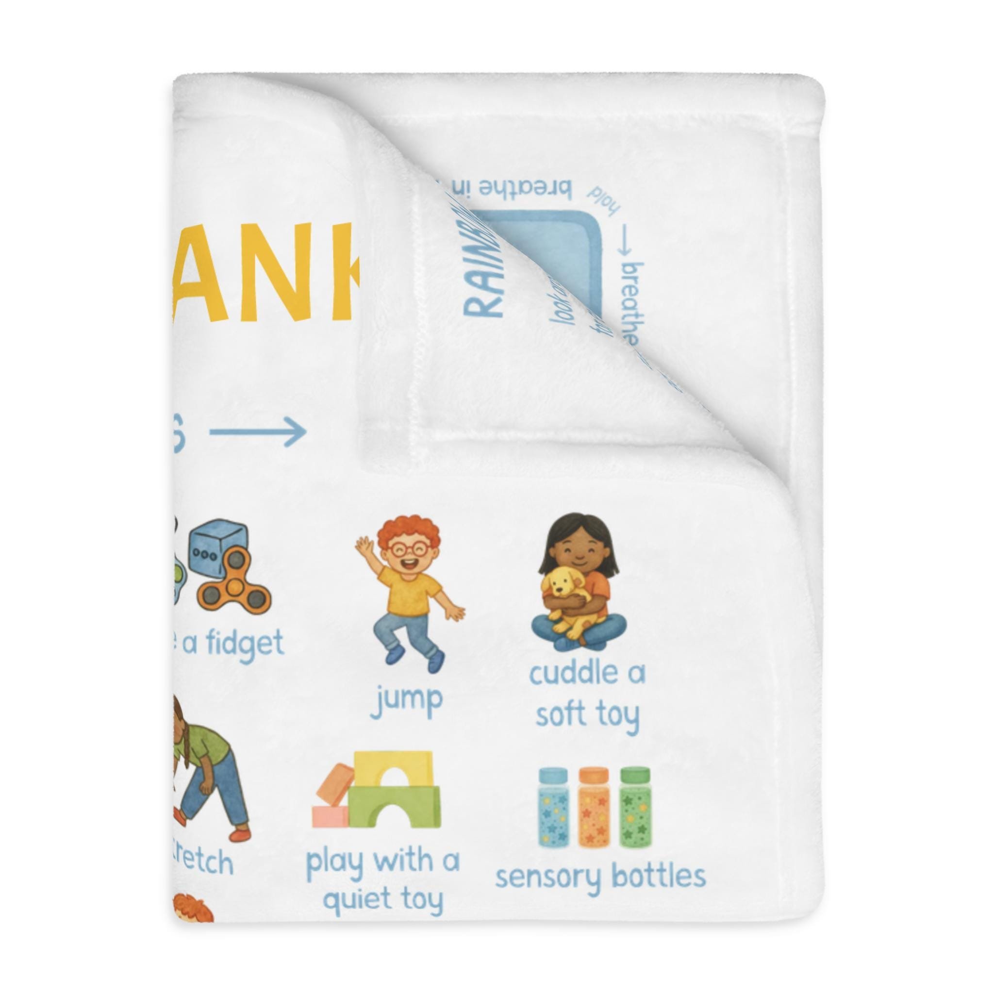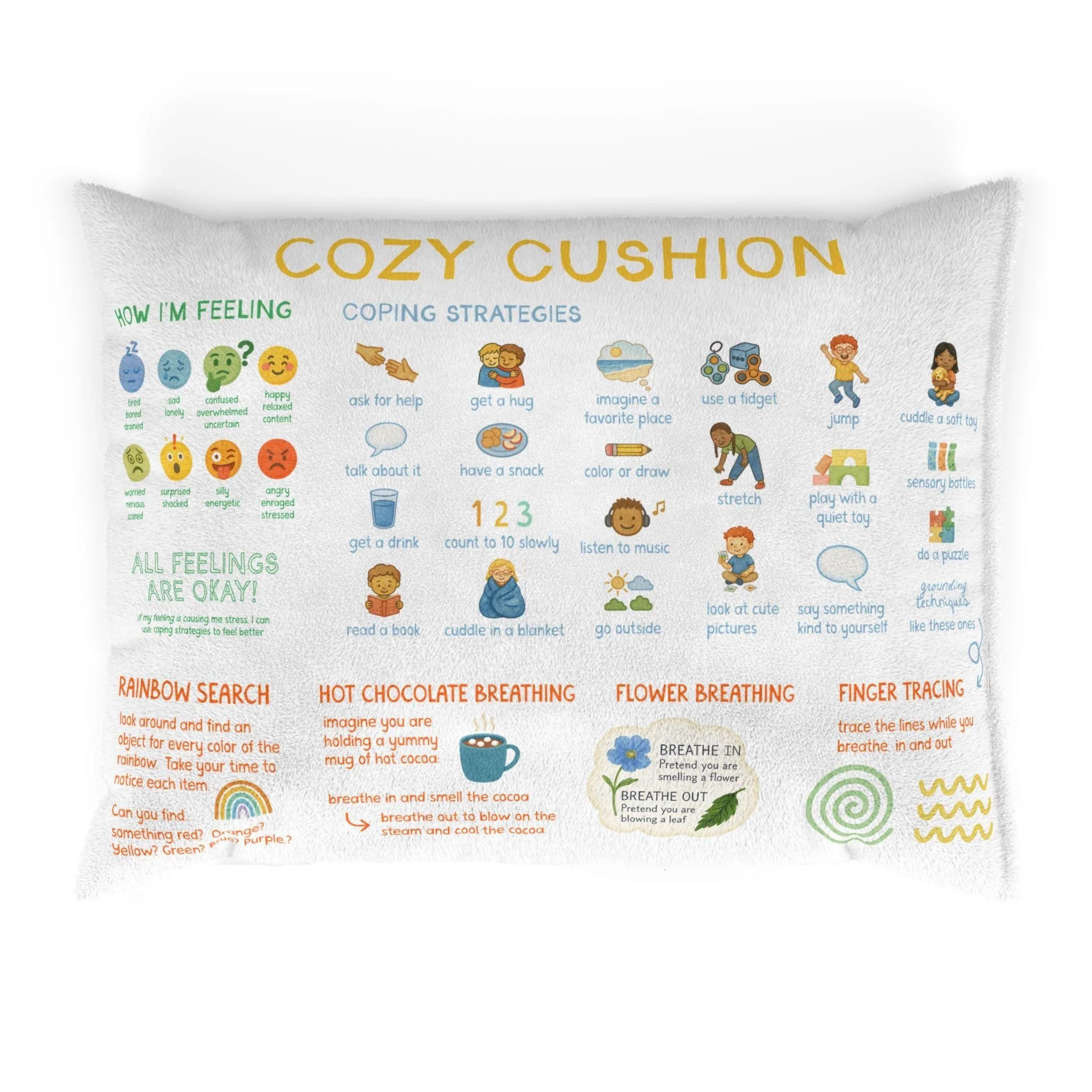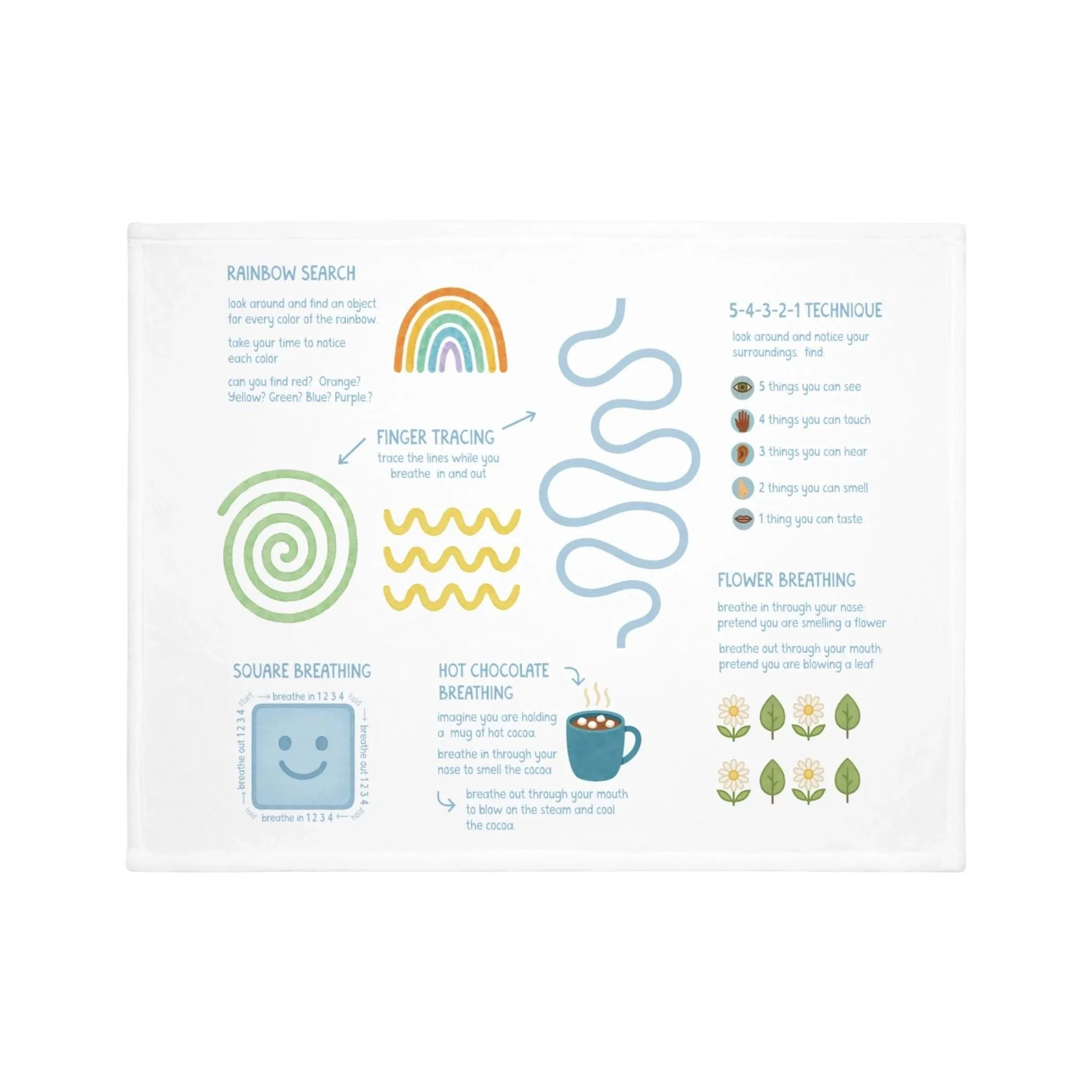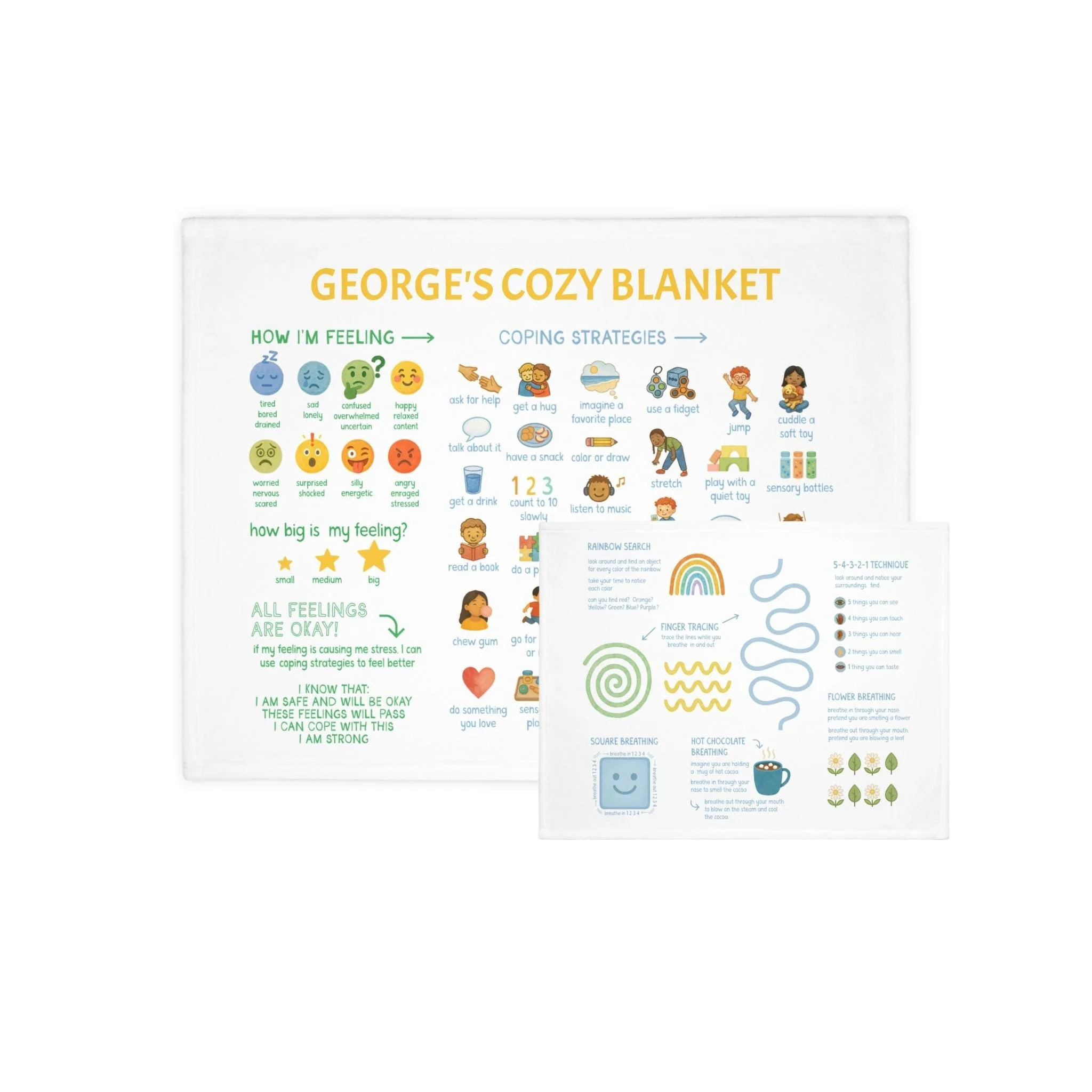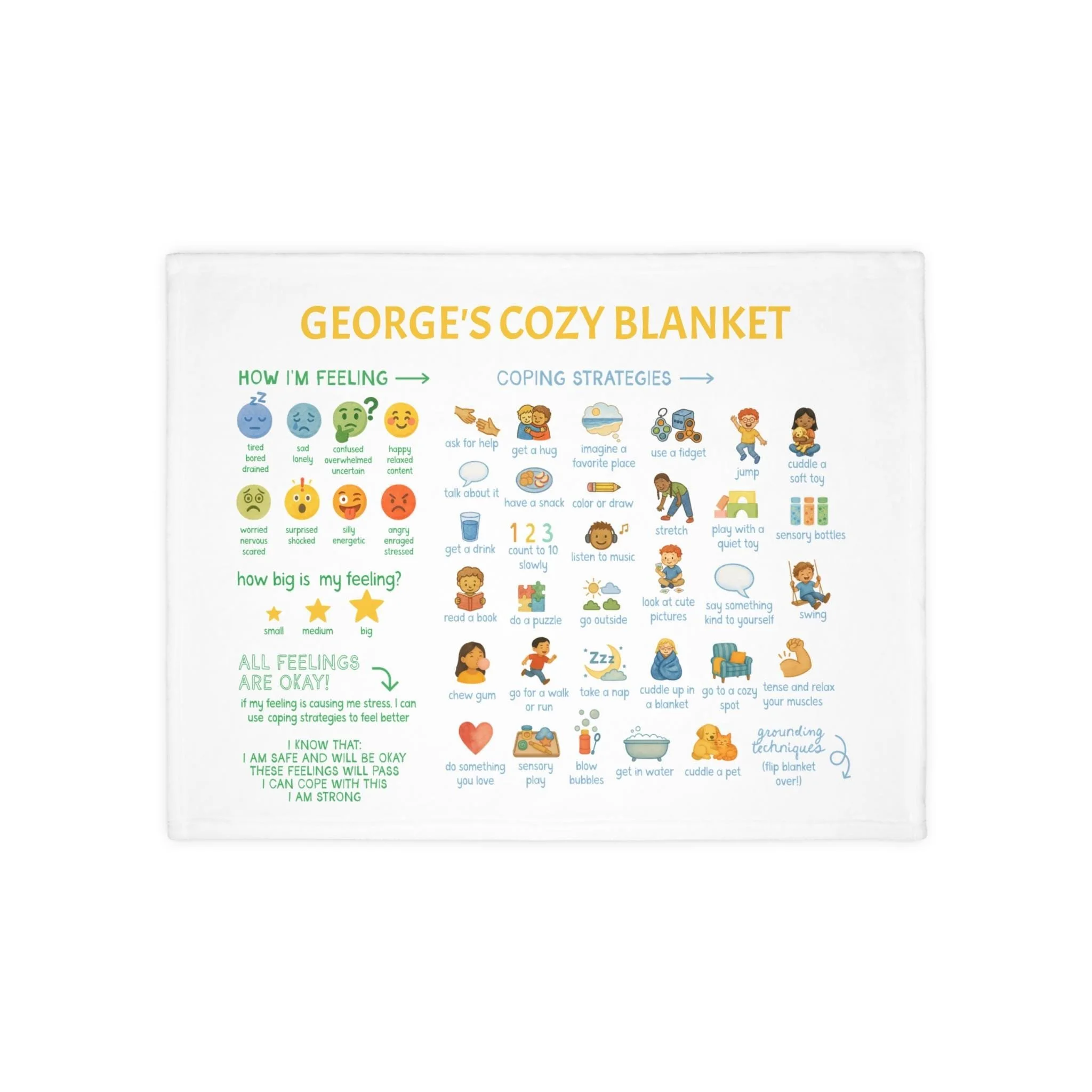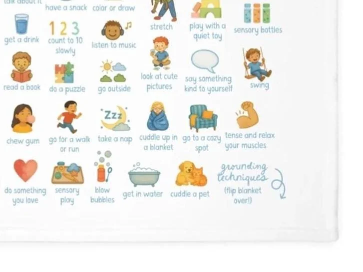 calming choices blanket with feelings chart, coping strategies, grounding techniques